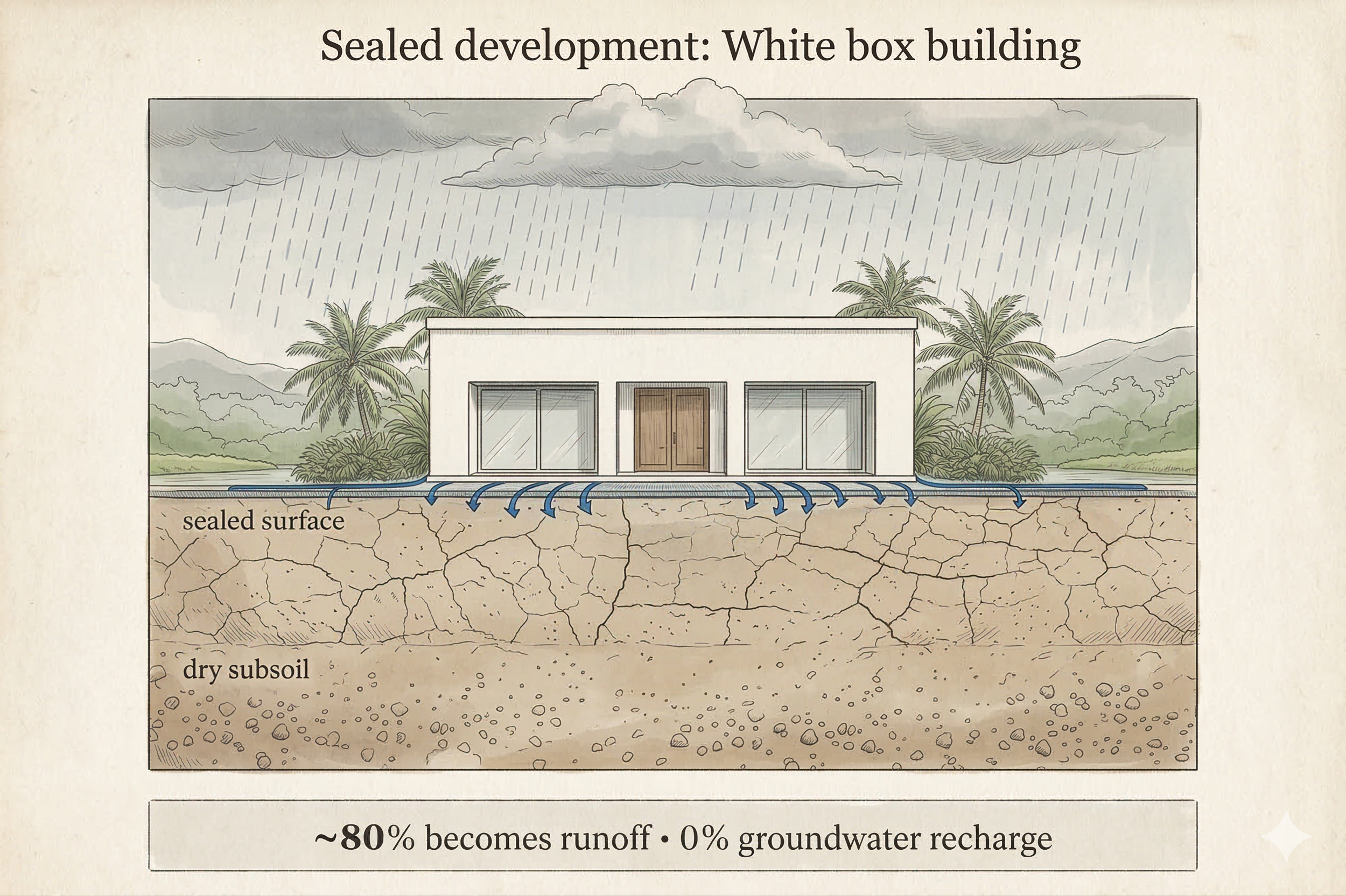 The math compounds in the other direction too. Every new sealed surface added to the catchment increases flood risk for every existing building around it. Every villa built without retention adds its rainfall to the street. The individual decisions are invisible; the collective result is the brown water rising up throughout Kerobokan.