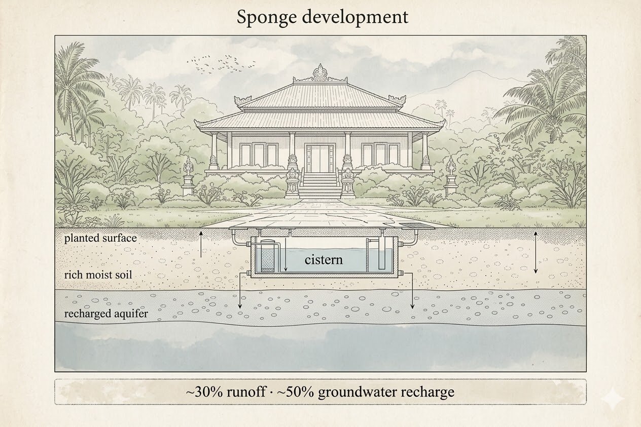 The qualification is real and worth stating honestly: these interventions are most effective for moderate, frequent rainfall events. For an extreme event — 385 millimetres in a single day — no building-scale intervention alone prevents flooding entirely. What distributed retention does is reduce the severity and duration of flood peaks, lower the baseline risk across the catchment, and recharge the groundwater that Bali is simultaneously draining from below. The polka dot infrastructure does not replace coordinated drainage investment. It buys time, reduces damage, and begins restoring a hydrological balance that decades of sealed construction have been quietly destroying.